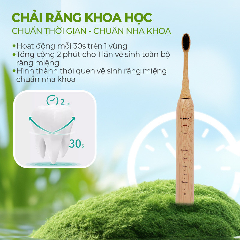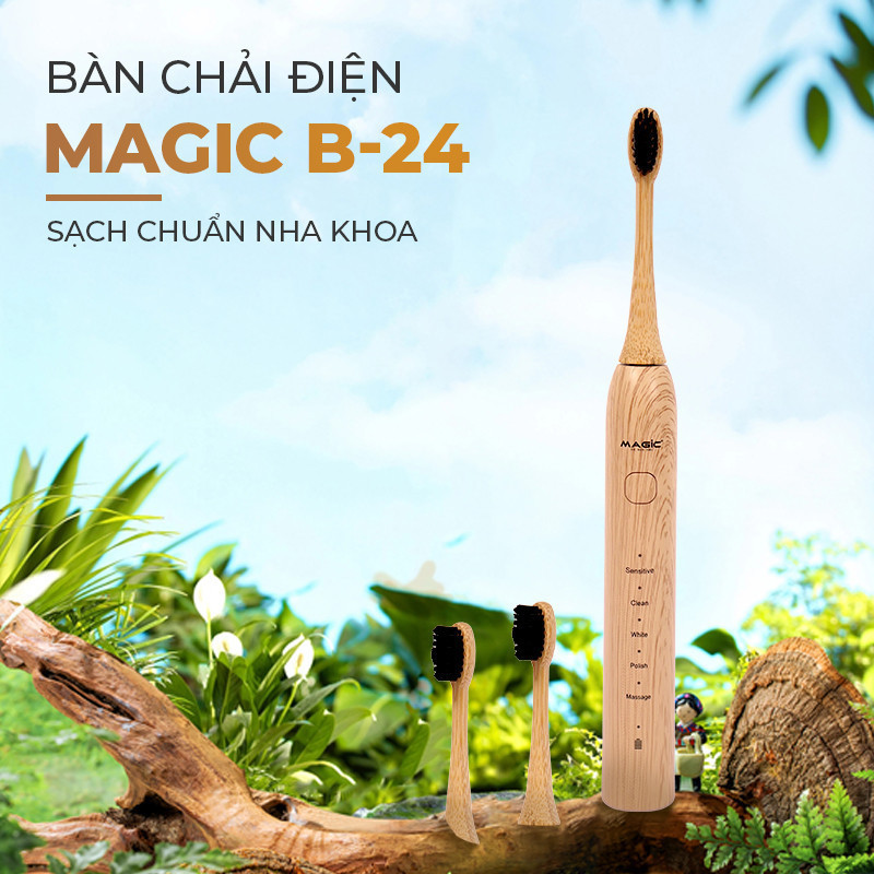 Bàn Chải Điện MAGIC B-24, chăm sóc răng miệng toàn diện tại nhà chuẩn nha khoa. Bàn chải thường không kiểm soát được thời gian đánh răng dễ gây nên nguy cơ sâu răng cao, nhiều mảng bám. bàn chải điện MAGIC B-24 giúp làm sạch mảng bám tới 10 lần so với bàn chải thông thường với nhiều chế độ khác nhau chải răng linh hoạt, làm sạch sâu, chăm sóc nướu và đơn giản sử dụng.