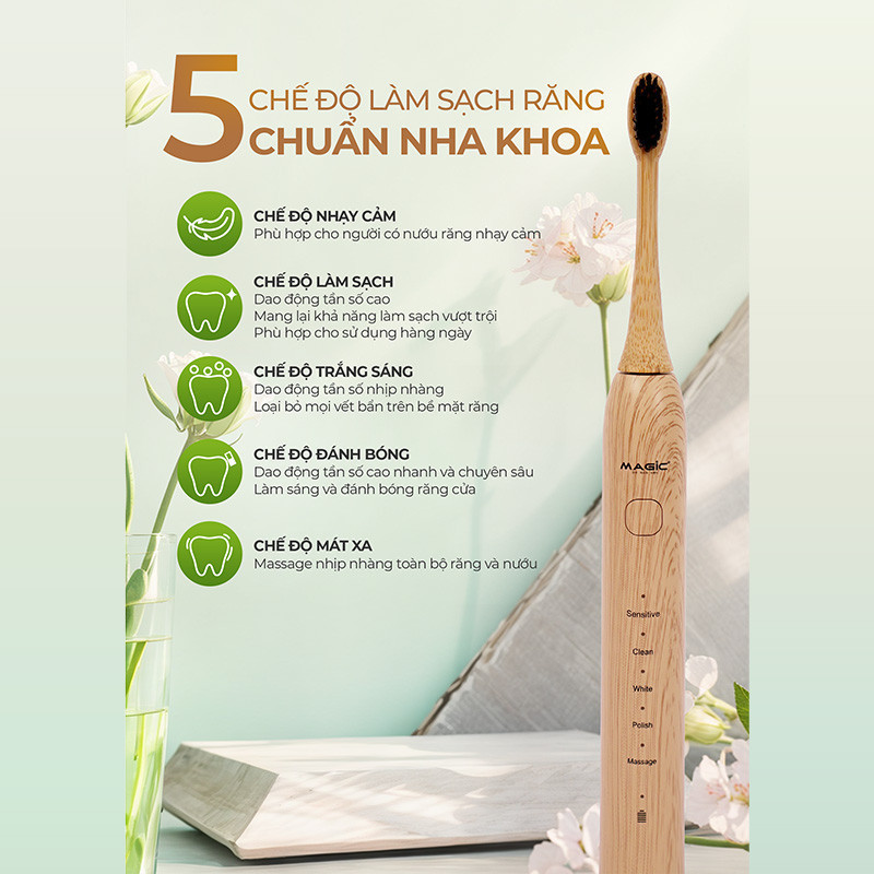 11.Chế độ: răng nhạy cảm, làm sạch, làm trắng, đánh bóng, massage