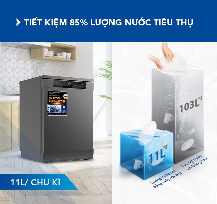 -Tiêu thụ nước: 11 lít/ chu kỳ rửa